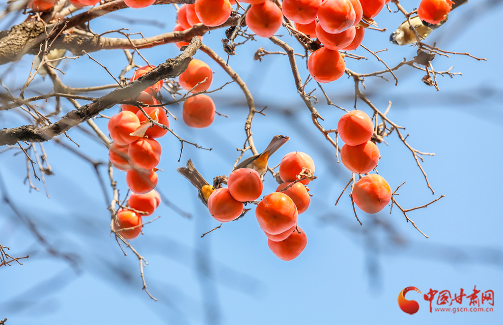 繁華落盡,枝條上一簇簇、一叢叢火紅的柿子在微風(fēng)中搖曳,吸引麻雀前來“聚餐”。麻雀們時而啁啾歡唱,時而蹦跳覓食,小巧的身影與柿子交織在一起,勾勒出一幅生動的冬日畫卷。