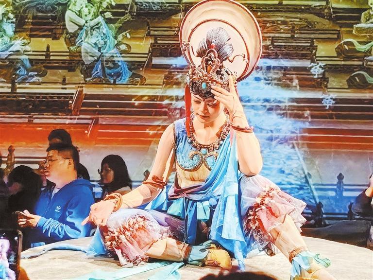 “真是一場酣暢淋漓的敦煌樂舞盛宴。雖然這趟旅程我們還沒有去敦煌莫高窟,但看罷這場演出,已經(jīng)對(duì)莫高窟壁畫有了初步的認(rèn)知。莫高窟壁畫的精華部分,借助高科技手段和演員的精彩演繹,在我們眼前立體延展開來,同時(shí)劇場內(nèi)大量復(fù)刻了佛龕、蓮花臺(tái)、藻井等特色形制,讓我們‘一眼入境’,帶我們走進(jìn)歷史深處,觸摸文明脈動(dòng)。”浙江游客王松攜家人觀看《樂動(dòng)敦煌》后,發(fā)出贊嘆。
