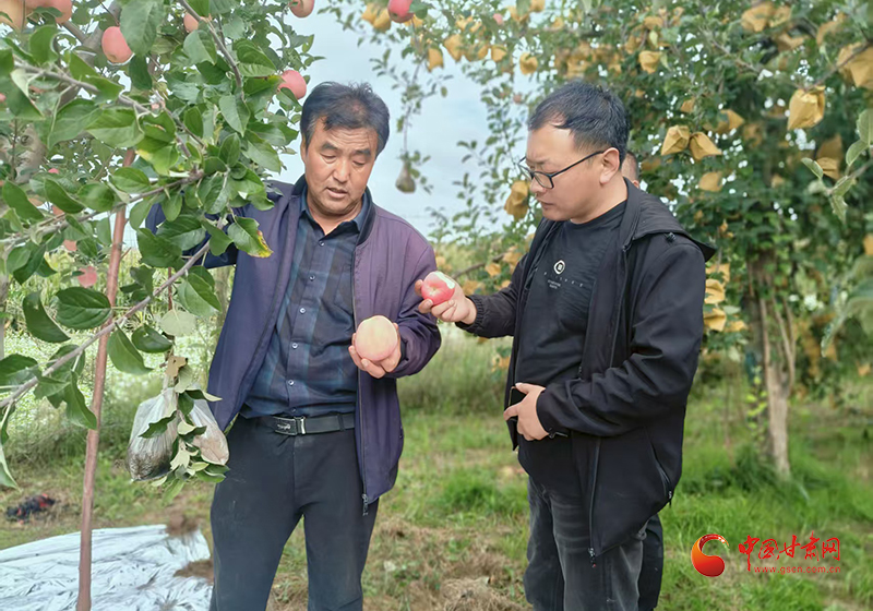 圖為果農杜效斌和李建國研究果品 朱強/攝