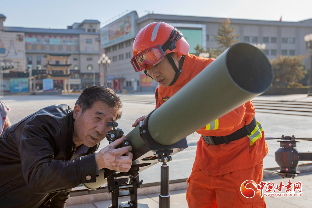 消防隊員給裕固族群眾講解地震救援裝備液壓擴(kuò)張器在救援中的用途