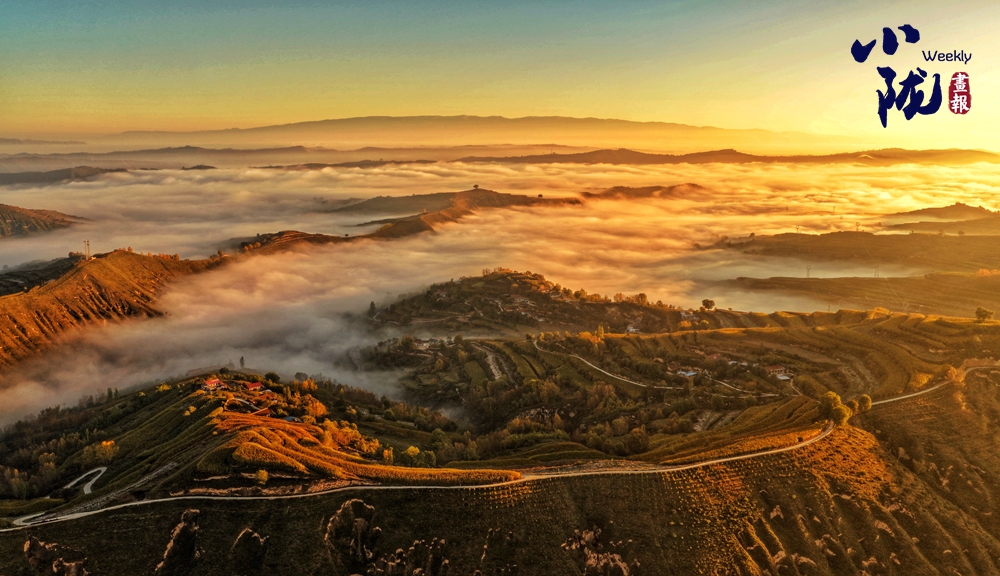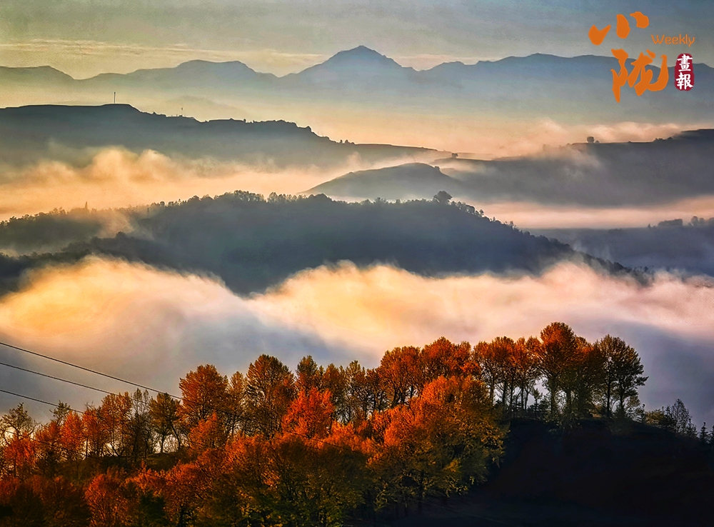 仿佛一夜之間,大北山被染成了暖黃色。極目遠(yuǎn)眺,云海漫過(guò)蒼翠的山脊,與天邊燃燒的晚霞交融成流動(dòng)的錦緞,夢(mèng)幻般的色彩恣意鋪張,金色與藍(lán)天、山坳交織在一起,格外溫馨浪漫。