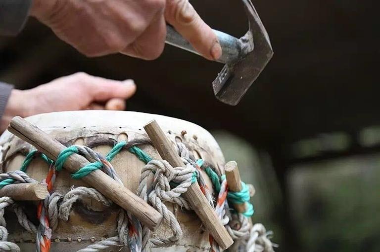 鼓做成后,放在陽(yáng)光下邊曬邊用重槌敲打,這叫“捶生牛皮”。鼓的聲音是捶打出來(lái)的。不捶打,鼓聲出不來(lái),即使這面鼓干到成形了,也是一面啞鼓。鼓槌要用柳木做成,這種由軟木頭做的鼓槌較輕,能在鼓面上彈起來(lái),用硬木頭做的鼓槌不但沒(méi)有這種性能,而且容易將鼓敲破。