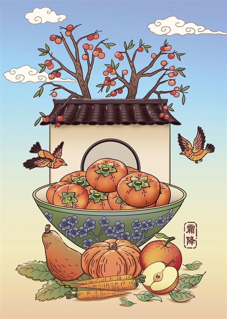 “對(duì)于節(jié)氣起源地區(qū)來(lái)說,‘霜降見霜花兒,立冬見冰碴兒’。”宋英杰表示:“雖然民間仍稱霜降為‘下霜了’,但在漢代,人們便已知曉霜是‘其由地發(fā),不從天降’的道理。因此,霜并非從天而降,而是遇物而凝。當(dāng)近地面的溫度低于0℃時(shí),水汽凝結(jié)成晶瑩的霜花或冰針。我們以‘凌霜做雪’形容性情的堅(jiān)韌,以‘飽經(jīng)風(fēng)霜’形容歲月的磨礪。‘風(fēng)刀霜?jiǎng)?rsquo;,霜被描述成一種鋒利的冷兵器,成為‘殺’的代名詞。”