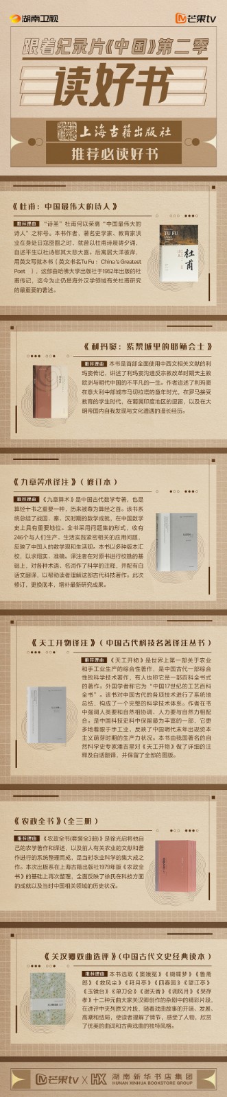 紀(jì)錄片《中國(guó)》第二季中,那些閃耀的“群星”,穿過(guò)歷史迷霧,用文字記錄璀璨歷史。一些給后世帶來(lái)深遠(yuǎn)影響的書(shū)籍,如穿過(guò)山川大地的季風(fēng),映照一個(gè)時(shí)代的思想源變和文化繁榮。中華書(shū)局、上海古籍出版社、岳麓書(shū)社在《中國(guó)》第二季熱播期間,縱覽歷史文化、人物傳記、文學(xué)名著等書(shū)籍類別,精選《杜甫:中國(guó)最外大的詩(shī)人》《農(nóng)政全書(shū)》《元曲三百首》《徐霞客游記校注》《東京夢(mèng)華錄箋注》等近20本優(yōu)秀書(shū)籍,推薦全民閱讀。