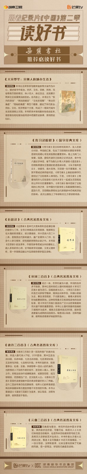 芒果TV以紀(jì)錄片《中國(guó)》第二季的精美品質(zhì),聯(lián)合湖南新華書(shū)店集團(tuán)的美譽(yù)口碑,將中華書(shū)局、上海古籍出版社、岳麓書(shū)社推薦的珍品好書(shū),傾情向大眾推薦。本次“跟著紀(jì)錄片《中國(guó)》第二季讀好書(shū)”活動(dòng),將從2月28日持續(xù)到3月15日,湖南新華書(shū)店集團(tuán)旗下湖南圖書(shū)城、不吝Boolink書(shū)店、全省市級(jí)中心門店、長(zhǎng)沙地區(qū)樂(lè)之書(shū)店等全員參與,推薦紀(jì)錄片《中國(guó)》第二季。書(shū)友及觀眾可登錄微博或到線下門店打卡參與活動(dòng)。