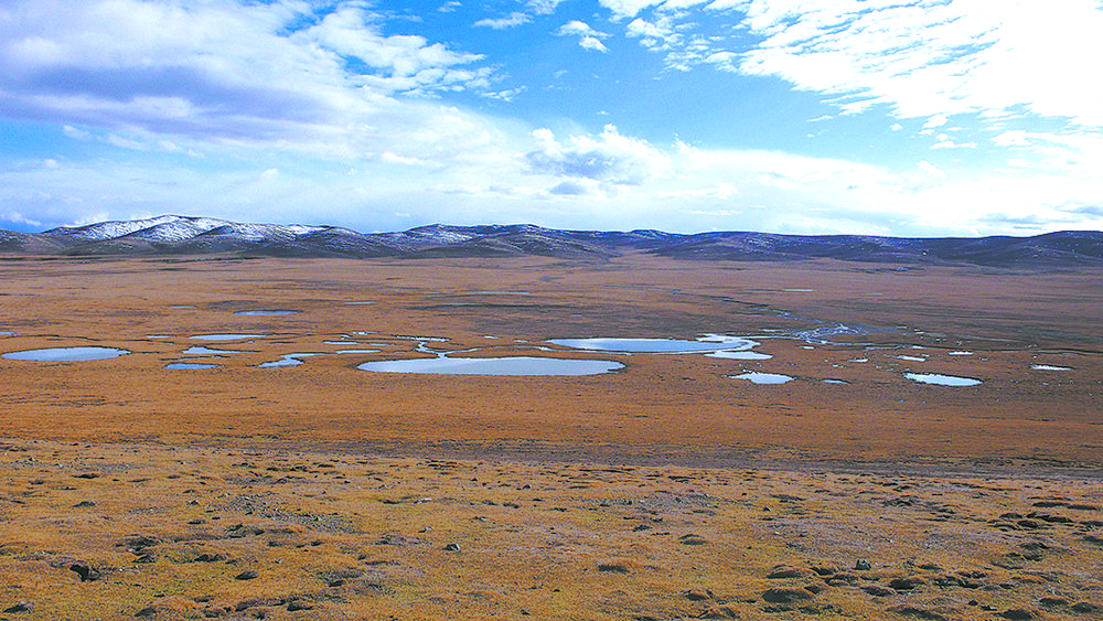 約古宗列位于青藏高原東北部,海拔高度在4200米~4800米,地勢(shì)西北高,東南低。站在腳下小泉邊,抬眼先看到的是西面距我們最近的雅合拉達(dá)合澤山,它是1952 年新中國(guó)第一個(gè)河源查勘隊(duì)曾認(rèn)定的黃河源頭山。南望,遠(yuǎn)處最高的雪峰,是長(zhǎng)江黃河的分水嶺巴顏喀拉山;視線左移,東方藍(lán)天白云下,同樣白雪皚皚的是阿尼瑪卿山。以約古列宗為中心輻射,在這東西長(zhǎng)約220 公里,南北最大寬150 公里的高山草甸帶與高山草原帶的過渡地帶,東面阿尼瑪卿山阻擋了東南暖濕氣團(tuán)西進(jìn),南面巴顏喀拉山又削弱了溯谷地北進(jìn)的西南季風(fēng)勢(shì)頭,再加之北面布爾漢布山的屏障作用,把源區(qū)與干旱的荒漠地區(qū)隔開,使這里年平均氣溫在-4℃左右。青藏高原半濕潤(rùn)地區(qū)氣候和遠(yuǎn)處雪山冰川的不斷融化,使母親河上源的兩眼泉和其他那些數(shù)不清的泉,源流不斷,經(jīng)年汩汩。