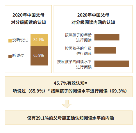 雖然分級(jí)閱讀已經(jīng)成為國(guó)際公認(rèn)的閱讀趨勢(shì),可是,從當(dāng)當(dāng)聯(lián)合艾瑞發(fā)布的《2020年中國(guó)K12階段學(xué)生“分級(jí)閱讀”白皮書(shū)》(以下簡(jiǎn)稱《白皮書(shū)》)中,我們發(fā)現(xiàn)中國(guó)大部分父母對(duì)于分級(jí)閱讀尚缺乏認(rèn)識(shí),更談不上有足夠的重視?!栋灼?shū)》指出,有65.9%的父母聽(tīng)說(shuō)過(guò)“分級(jí)閱讀”,而其中真正了解“分級(jí)閱讀”的父母只占45.7%。