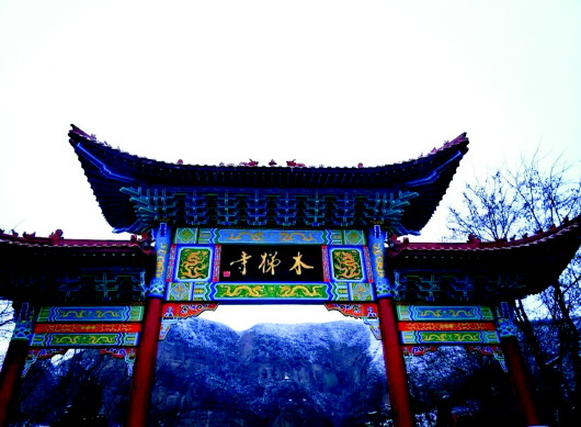 “素練披新山,銀樹列白川。”冬日的木梯寺被陣陣寒意包圍,顯得更加厚重。彩色牌樓挺立在白茫茫的山間,被襯托得分外鮮艷,“木梯寺”三個大字雄宏大氣,配合著這壯觀的景色,琉璃瓦下綴著水晶冰柱,像俏皮的小尾巴,為這幅水墨畫更增添了幾分頑皮。
