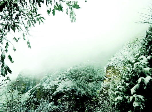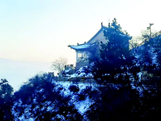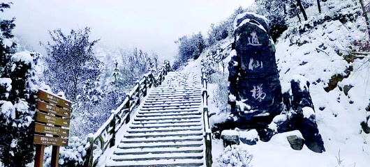 白雪覆蓋著天地間的一切喧囂,此時,朝著山門向上望去,通天梯沒入天際,天與山的交界處一片蒼茫,分不清是云是煙,似乎上面真是仙境,讓人忍不住想要探尋。