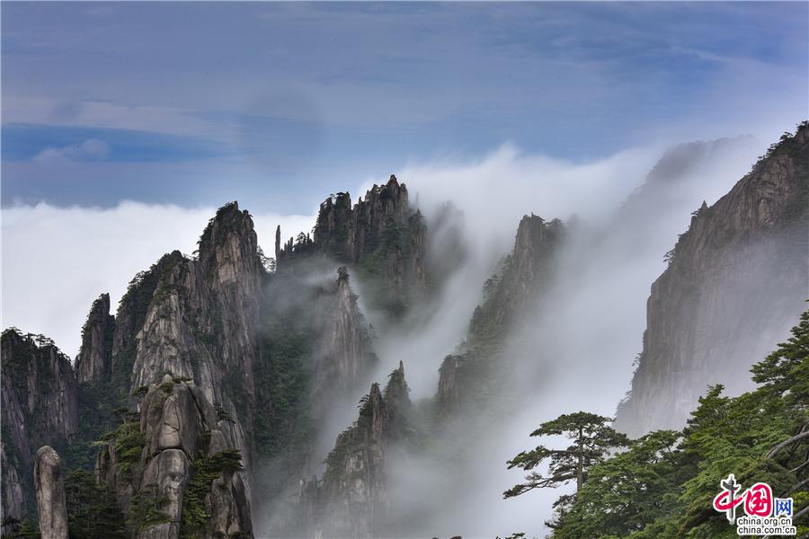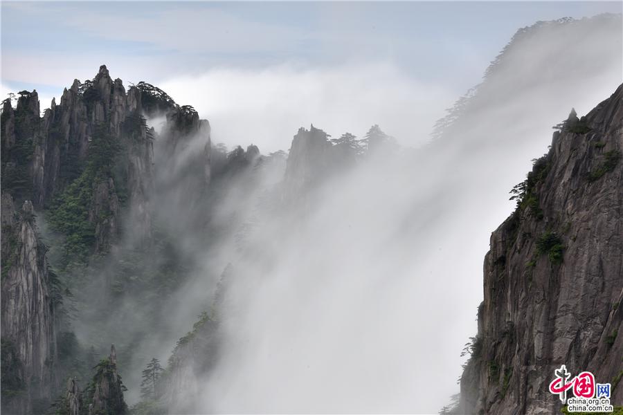 5月22日傍晚,雨后安徽黃山風景區(qū)現壯觀的云海奇觀,見云海奔騰而來,越過北海的始信峰,沿著群峰傾瀉而下勢如瀑布之壯觀,在奇群、怪石和形態(tài)各異黃山松的作用下勾勒出一幅幅流動的水墨畫;黃山不僅是云霧之鄉(xiāng),更是中國傳統(tǒng)水墨畫的天然的素材。(姚育青)