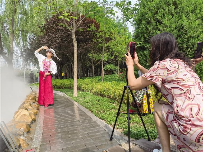 “一枝獨(dú)秀”團(tuán)隊(duì)的王大姐和姐妹們帶著專(zhuān)屬攝影師正在這里攝影留念。王大姐告訴記者,這是她們今年第2次來(lái)這里打卡。“這里的花真美,每年我們都會(huì)來(lái),拍照發(fā)在網(wǎng)上,收獲無(wú)數(shù)點(diǎn)贊,心情別提多美了。”說(shuō)話(huà)間,姐妹們又?jǐn)[了幾個(gè)造型,攝影師按下快門(mén),精準(zhǔn)捕捉唯美瞬間。“4公里外的寓言故事園最近也特別火,過(guò)兩天我們就去打卡。”王大姐說(shuō)。