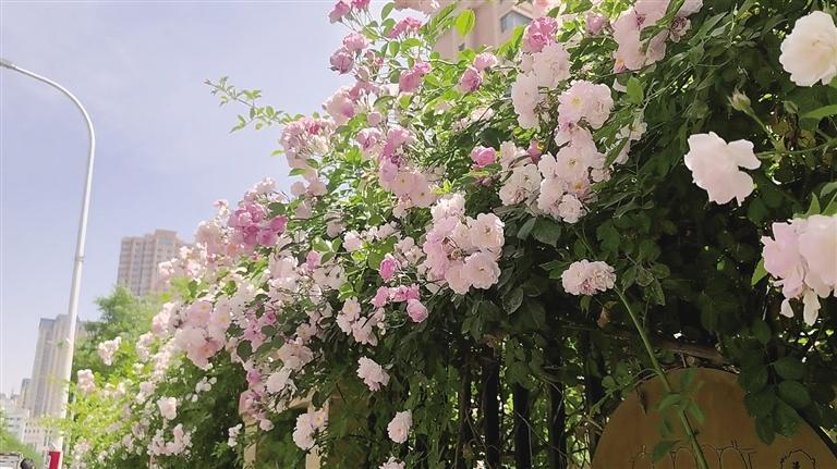 除了仙氣飄飄的“瑤池”,安寧區(qū)還有一處網(wǎng)紅打卡地非常火爆,那就是位于黃河印象路北段近400米的花街。上午11時(shí),記者在現(xiàn)場(chǎng)看到道路兩側(cè)開(kāi)滿(mǎn)了鮮花。道路東側(cè)的圍欄是銀灘雅苑小區(qū)的外墻,以粉色、白色為主的薔薇開(kāi)得正艷,微風(fēng)拂過(guò),掛滿(mǎn)花朵的枝干輕輕搖曳。道路西側(cè)開(kāi)滿(mǎn)了4種顏色的月季花,蜜蜂在花間飛舞采蜜,一眼望去,繁花似錦。