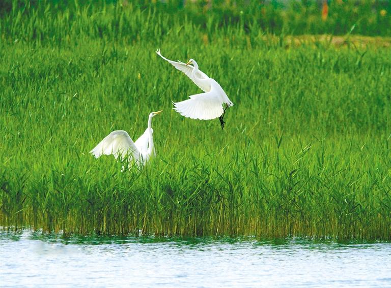 初夏的甘肅張掖國家濕地公園蘆葦青青,幾只白鷺在綠色的蘆葦中時而嬉戲飛翔,時而駐足覓食,成為濕地一道美麗風(fēng)景。 人民網(wǎng)照片