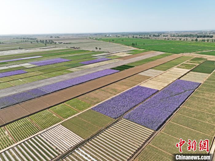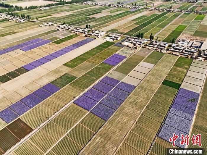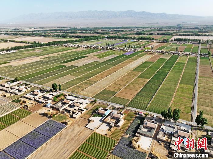 夏日時節(jié),甘肅省張掖市高臺縣駱駝城鎮(zhèn)紅新村和梧桐村的田野間,農(nóng)舍青青、遍野吐翠,阡陌縱橫間五彩斑斕,構(gòu)成一幅美麗的田園風光畫。