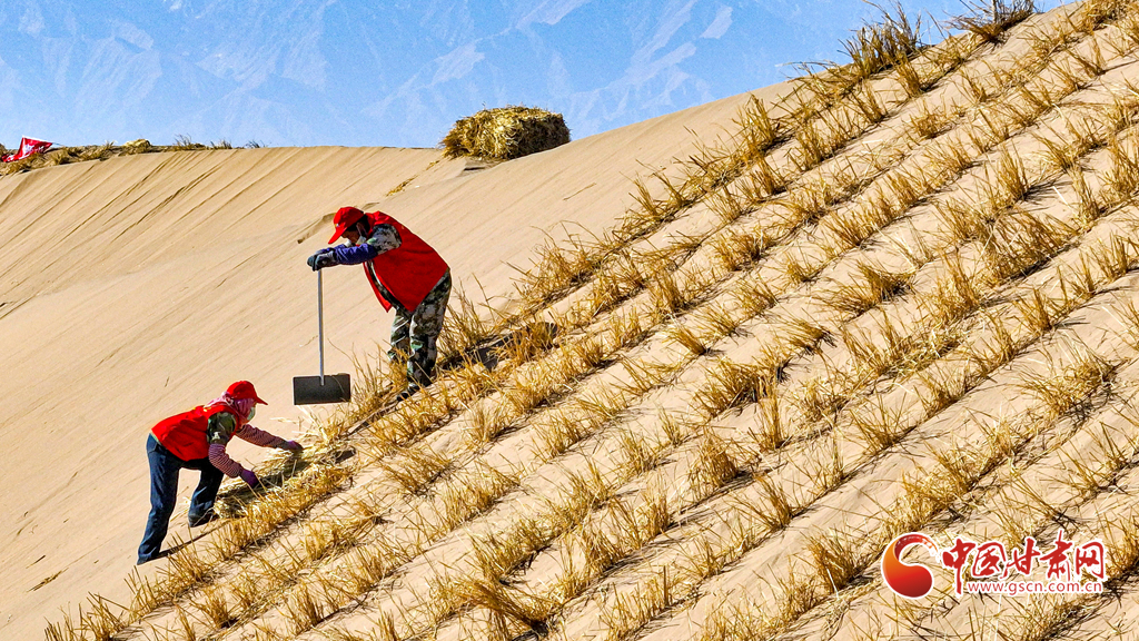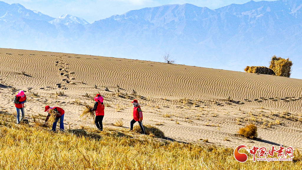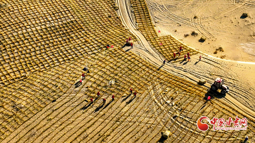 連日來(lái),在張掖市肅南裕固族自治縣明花鄉(xiāng)西南部的干旱荒漠區(qū),運(yùn)草車輛往復(fù)穿梭,1600余名治沙工人于巴丹吉林沙漠西南緣的沙丘間忙碌作業(yè)。他們劃線、背草、俯身鋪草、揮鍬壓埋,全力營(yíng)建沙障與固沙林帶,為沙漠牢牢“鎖邊”。