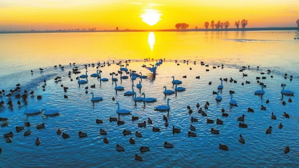 11月20日,甘肅金塔縣芨芨水庫(kù)濕地,遷徙越冬的白天鵝、赤麻鴨成群翔集湖面,成為初冬一道靚麗風(fēng)景。近年來(lái),金塔縣持續(xù)改善生態(tài)環(huán)境,加強(qiáng)濕地保護(hù)與修復(fù)工作,為水鳥(niǎo)提供了理想的棲息場(chǎng)所,每年在此棲息的候鳥(niǎo)多達(dá)數(shù)萬(wàn)只。 奔流新聞·蘭州晨報(bào)通訊員 曹紅祖 李鵬 段金龍 攝